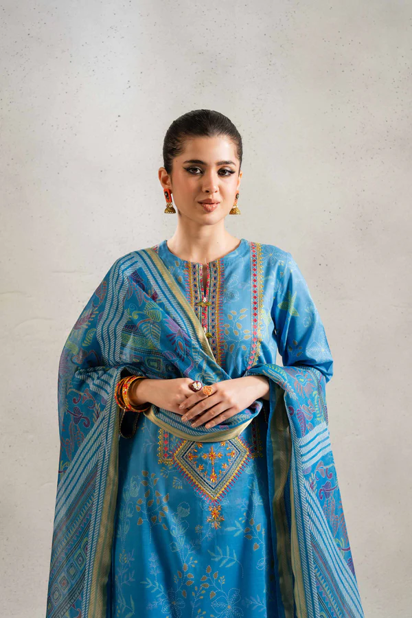 3 Piece – Printed Embroidered Suit – PE25-96 (INDIGO)