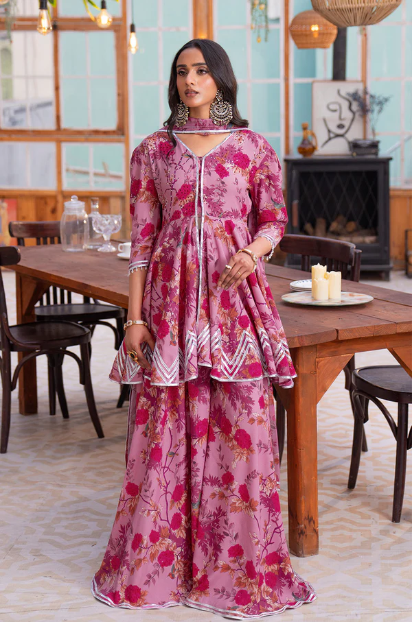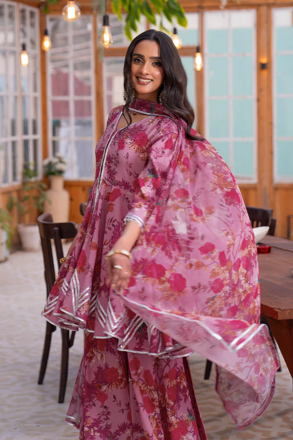 Our signature look, this pink grip peplum and sharara ensemble is adorned with a mesmerizing chinoiserie print, where delicate florals weave a story of timeless elegance. The bodice sparkles with colorful stonework, adding a regal charm, while intricate gota detailing graces the hem, sleeves, and sharara, elevating the design with traditional finesse. A matching chiffon dupatta, embellished with gota, completes the look, making this ensemble a true celebration of refined craftsmanship and effortless grace.