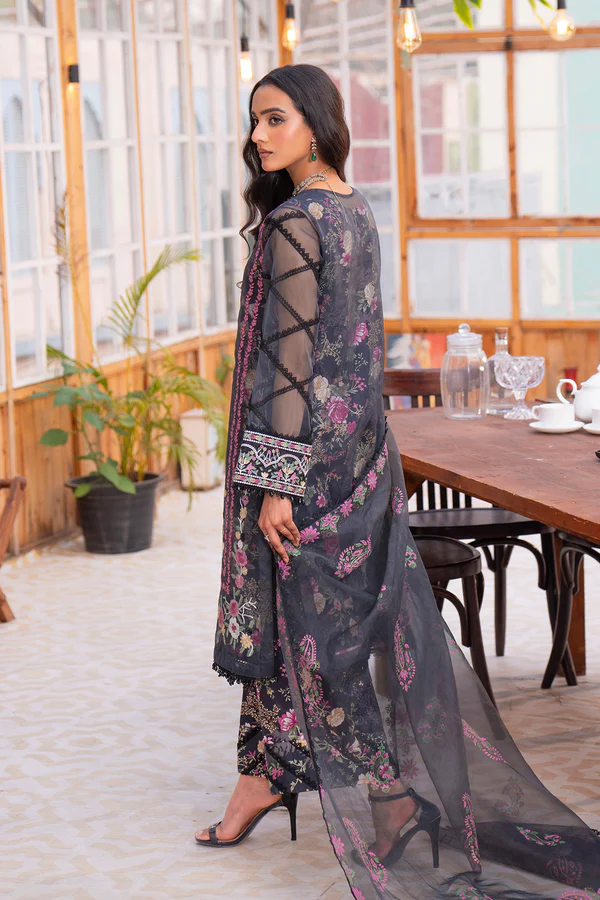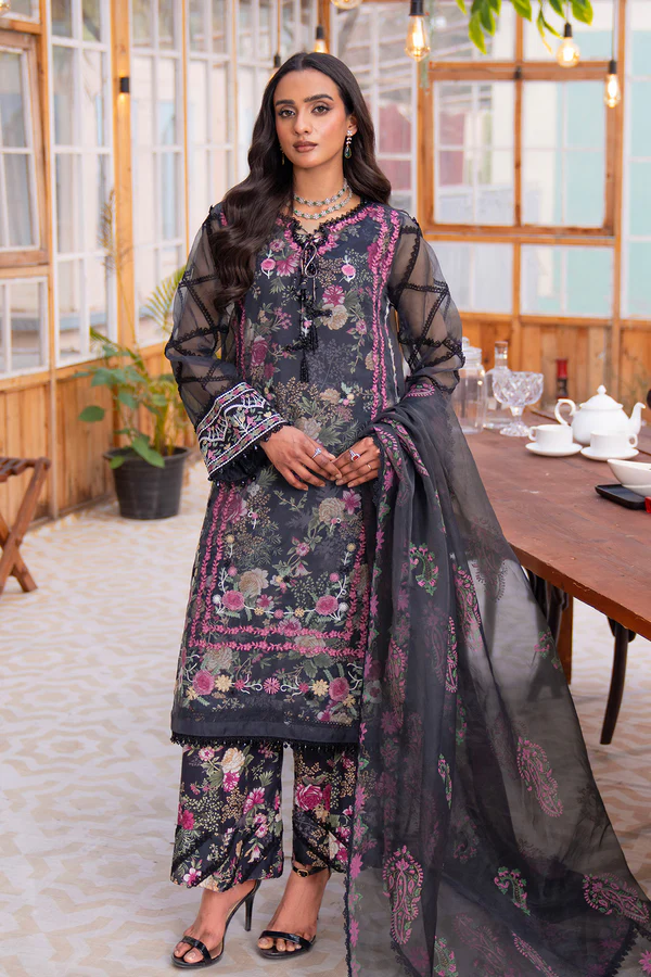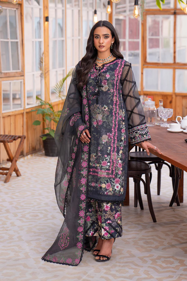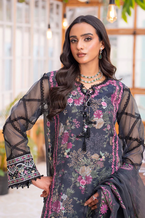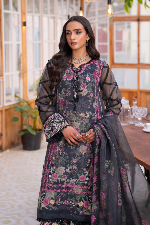 A graceful four-piece ensemble that blends elegance with intricate craftsmanship. The soft lawn lining and trousers bloom with vibrant floral prints, offering a breath of freshness. Layered above, the organza shirt is a masterpiece of embroidery, exuding sophistication in every thread. The lace-adorned sleeves, hem and neckline add a touch of timeless charm, while the block-printed dupatta harmonizing with the floral hues of greens and pinks, and complete the look with effortless grace.